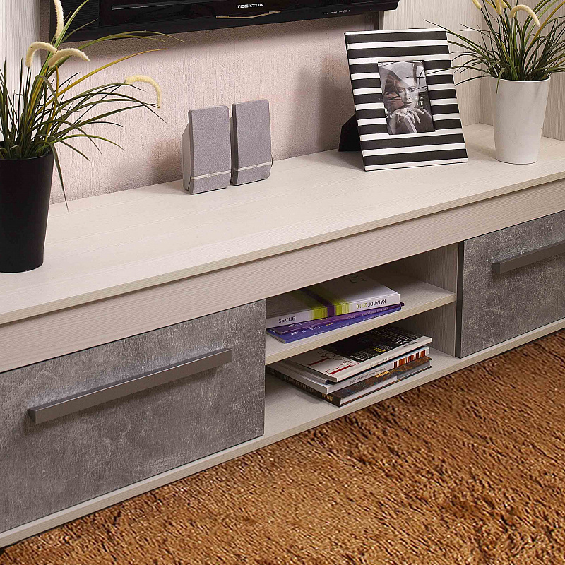 Мебель под ТВ в спокойной сероватой гамме идеально впишется в современный городской интерьер. Фасады ящиков "под бетон" хорошо обыгрывают серебристые ручки из массива дерева. Ящики комплектуются шариковыми направляющими полного выдвижения, что обеспечивает им легкую простую установку и максимальное использование полезной площади ящика. Глубина ящика 40 см, высота 17 см, ширина 51 см. Регулируемые опоры позволяют компенсировать незначительные неровности пола.