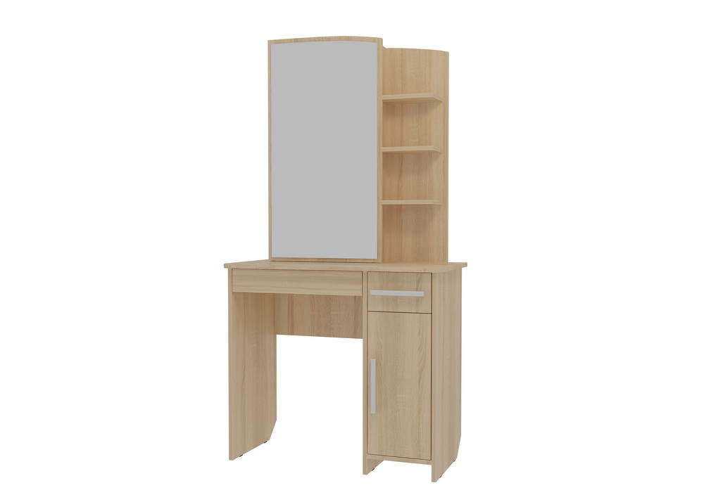 Трюмо «Виктория 1» выполнено в цвете дуб Сонома. Полки для парфюмерии и косметики, ящики для украшений, фена и мелочей.
