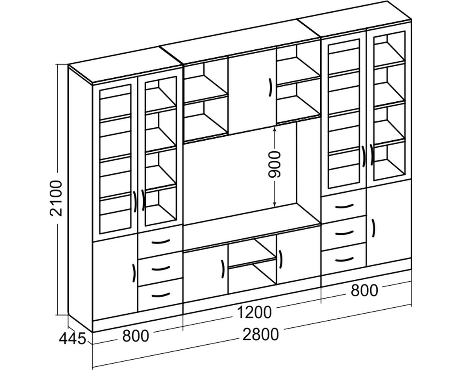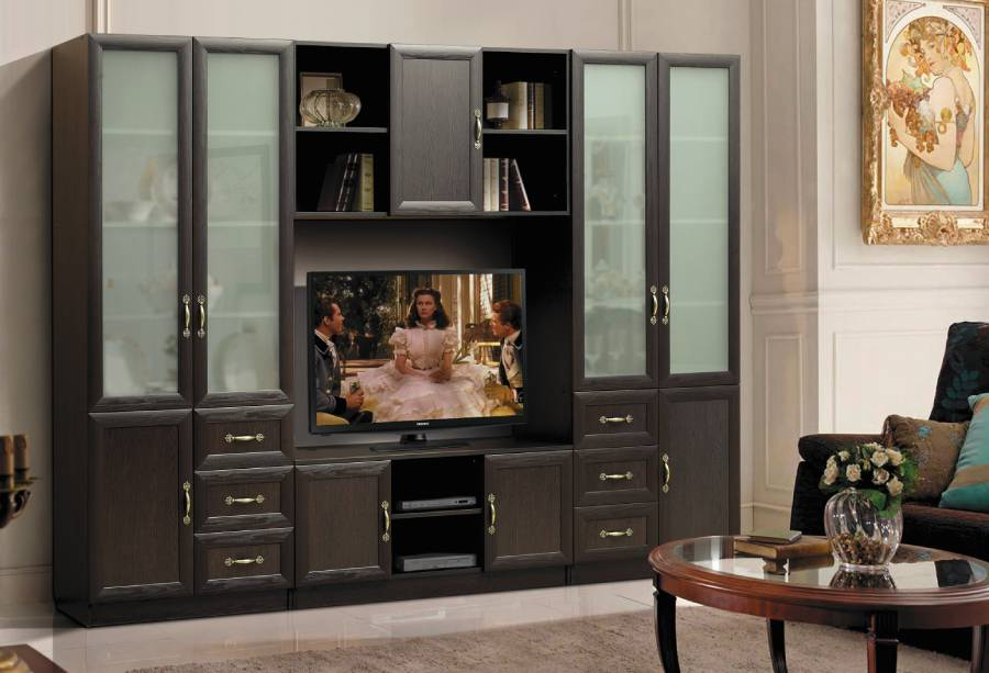 Элегантная строгая модель, выполненная в классическом стиле, станет отличным выбором для обустройства вашей гостиной. Система хранения, включающая две витрины, ТВ-тумбу, а также открытые и закрытые ниши, позволит разместить все необходимые вещи - от чайного сервиза до книг и элементов декора.