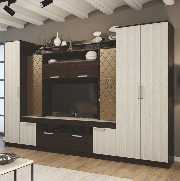 Центральная секция с нишей под ТВ оснащена обилием полок и выдвижными ящиками. Украшением служат пеналы по бокам со створками из матового стекла и рисунка в виде ромба. Гостиная имеет нишу под ТВ размерами 770*1204*460 мм.