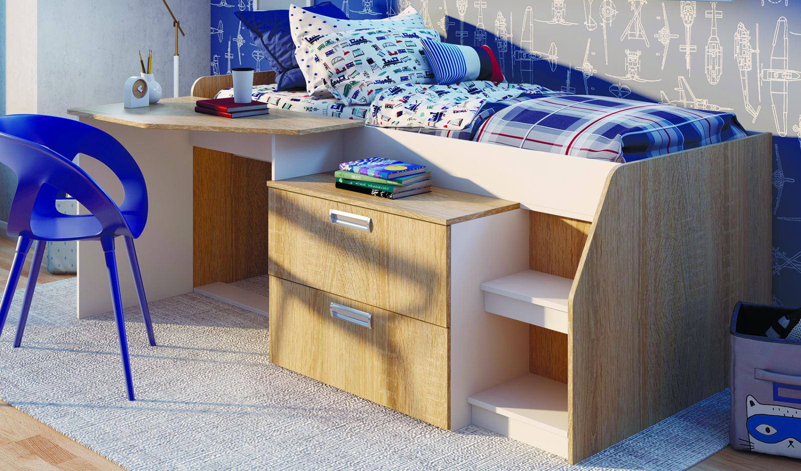 Стильный универсальный детский уголок "Скаут" подойдет как мальчику, так и девочке. Компактная композиция создана для небольших помещений: удобная кровать, выдвижные ящики, небольшой стол занимают минимум полезной площади комнаты.