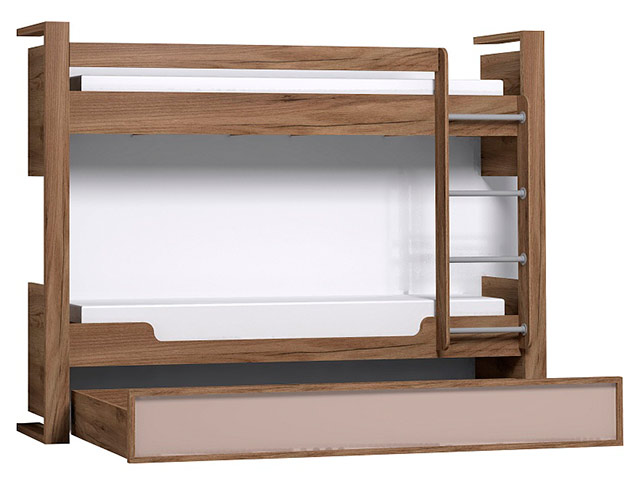 Отличным решением, позволяющим сэкономить место в небольшой квартире, будет двухъярусная кровать. В комплектации кровати - лестница с металлическими перекладинами диаметром 25 мм. Помимо спального места, на верхнем и нижнем ярусах кровати имеются дополнительные боковые ниши, которые помогут подростку держать под рукой необходимые перед сном вещи. Хранить постельное белье будет удобно в выдвижном ящике на выкатных роликах. При необходимости можно организовать дополнительное спальное место другу, который останется ночевать. Для этого достаточно убрать разделитель и положить матрас. Ещё одно из преимуществ этой кровати - встроенное зарядное устройство CHARGE-S USB. Используется для зарядки мобильных телефонов, планшетов. Устройство имеет компактные размеры, что позволяет разместить его прямо в нише кровати. Такая функциональная кровать не оставит равнодушными ни родителей, ни детей.