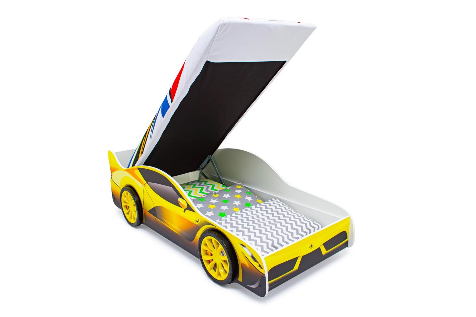 Детская кровать-машина “Феррари” с подъемным механизмом станет любимым местом для сна и игр мальчика или девочки от 2 до 10-12 лет.