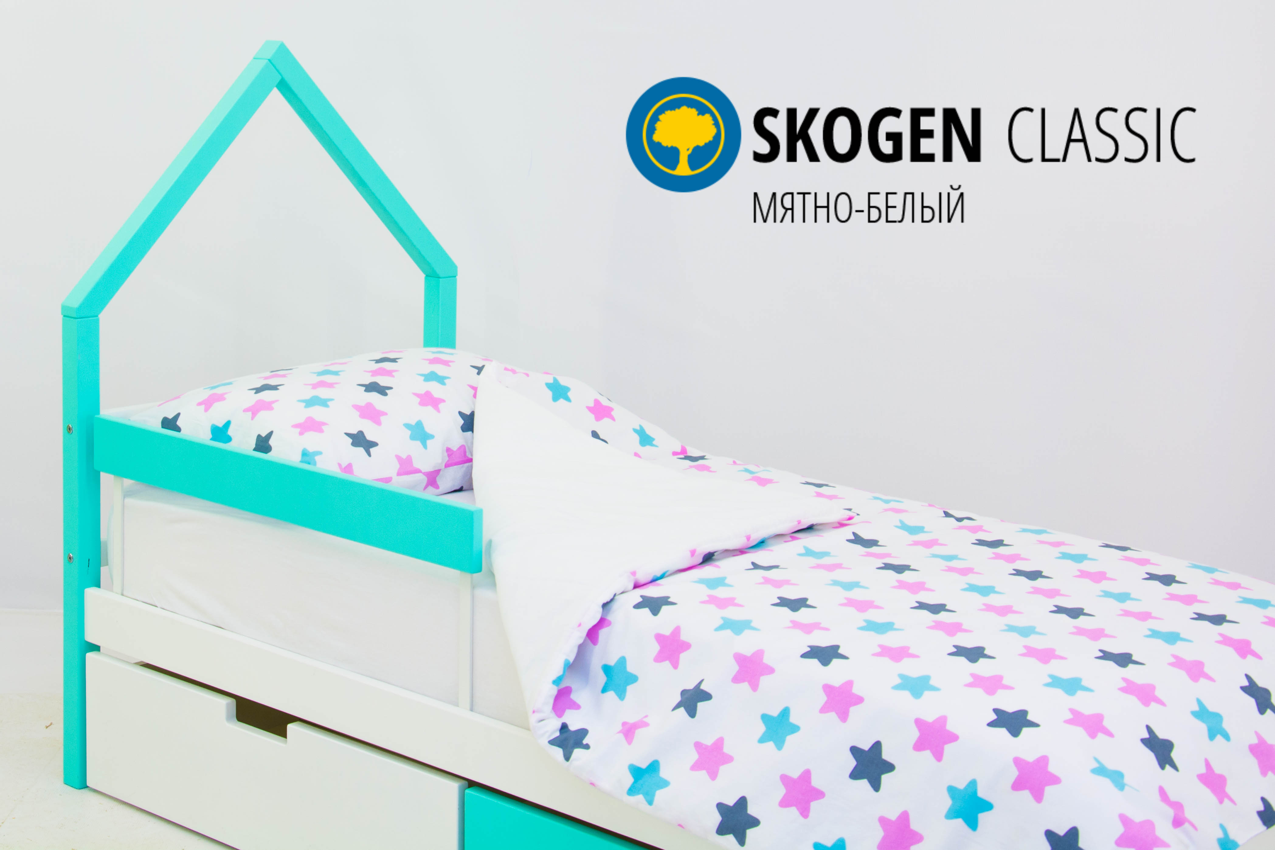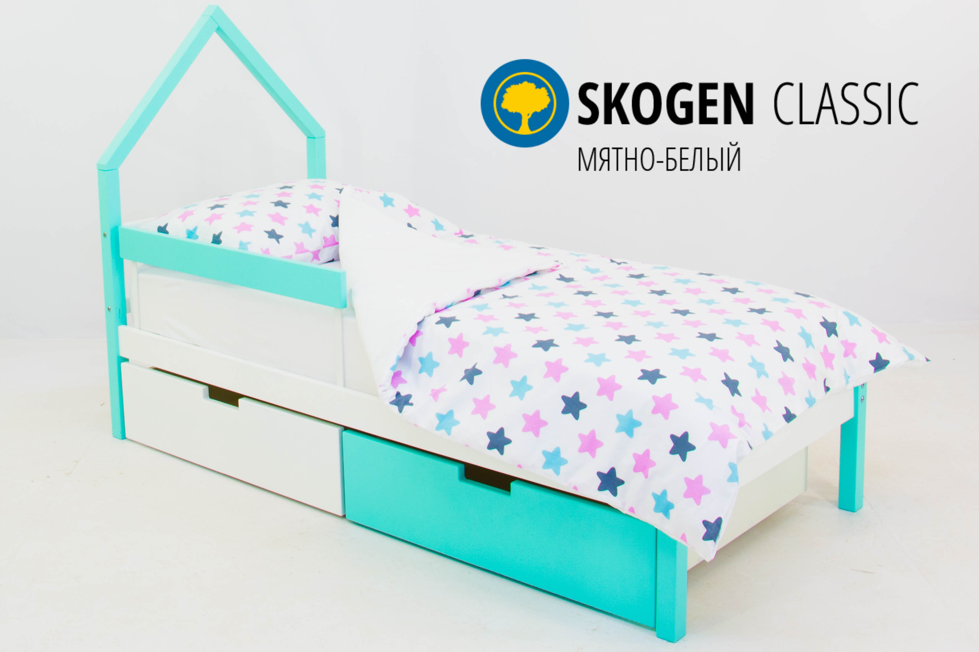 Экологически безопасный материал из натуральной сосны, соответствующий всем ГОСТовым нормам, не только безопасен для ребенка, но и отличается долговечностью, прост в эксплуатации и влагостоек, а дополнительный низкий бортик не только не даст маленькому непоседе выпасть из кроватки во время сна, но и позволит ему самостоятельно забираться в кроватку. Снизу могут располагаться два вместительных ящика для размещения постельного белья или же детских игрушек (комплект ящиков является дополнительным аксессуаром и не входит в стандартную комплектацию). Кровать-домик мини «Skogen дерево-белый» оснащена простой инструкцией по сборке, которую можно осуществить в течение 10 минут.