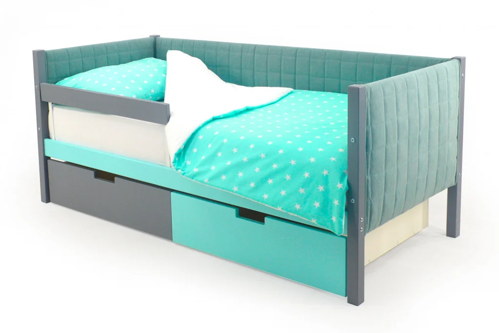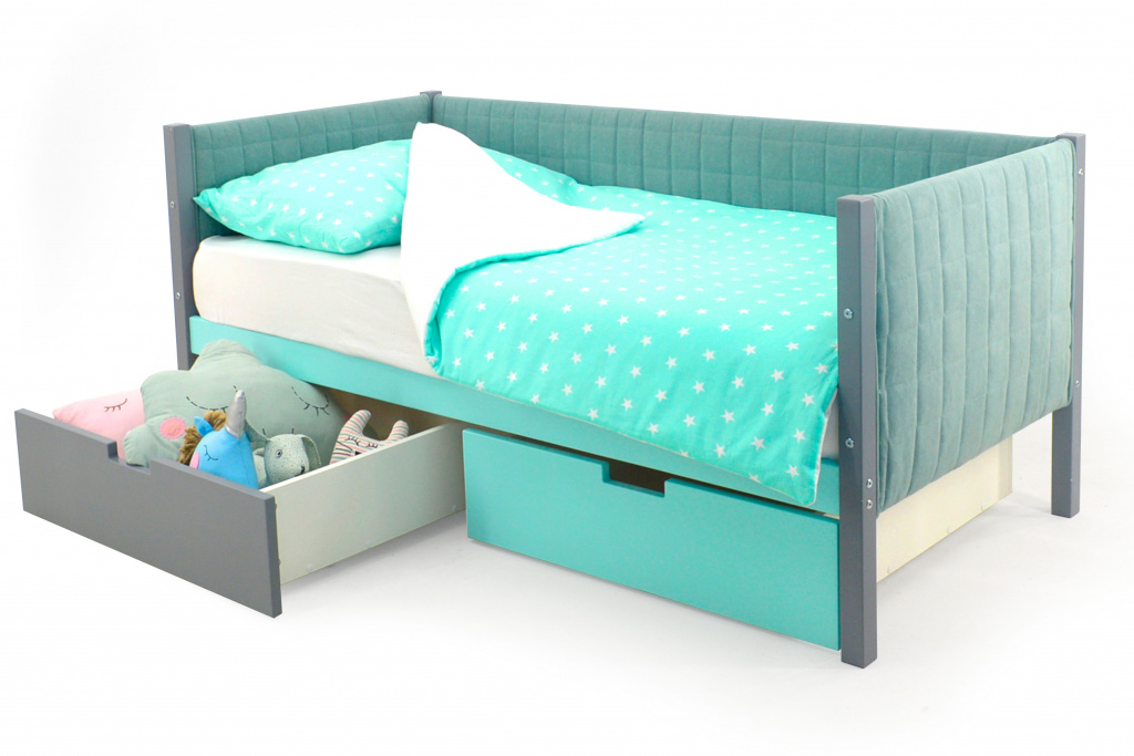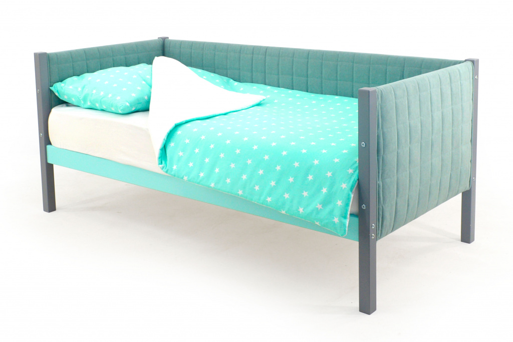 Детская мягкая кровать-тахта Бельмарко “Svogen графит-мятный” станет любимым местом для сна и игр мальчика или девочки от 2 до 10-12 лет.