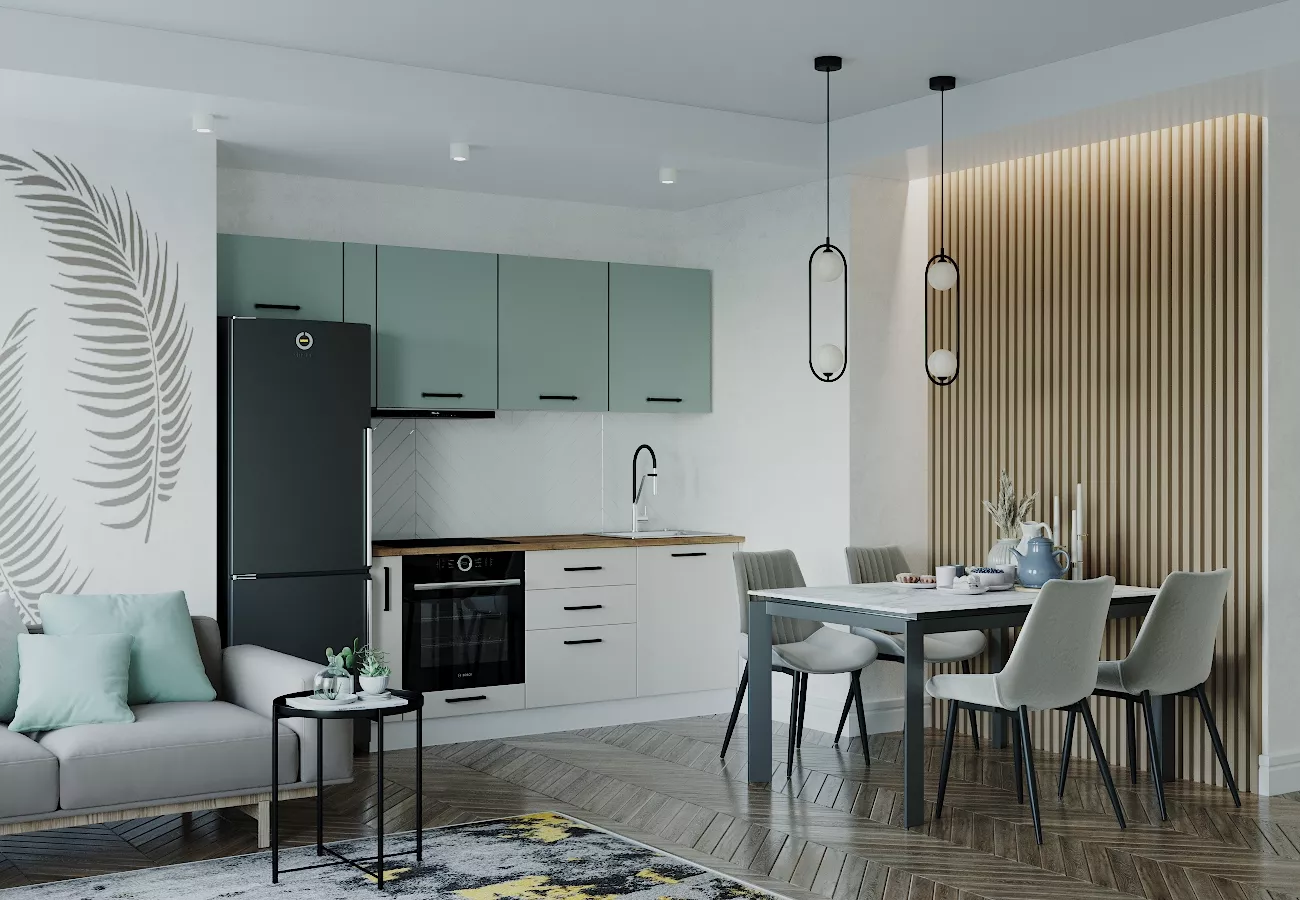 Фасады верхних модулей со свесом 12 мм дают возможность использовать без установки ручек.