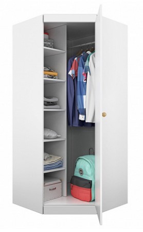 Угловой шкаф отлично сочетается со стеллажом и пеналом из той же коллекции, вместе они организуют полноценную гардеробную для малыша.