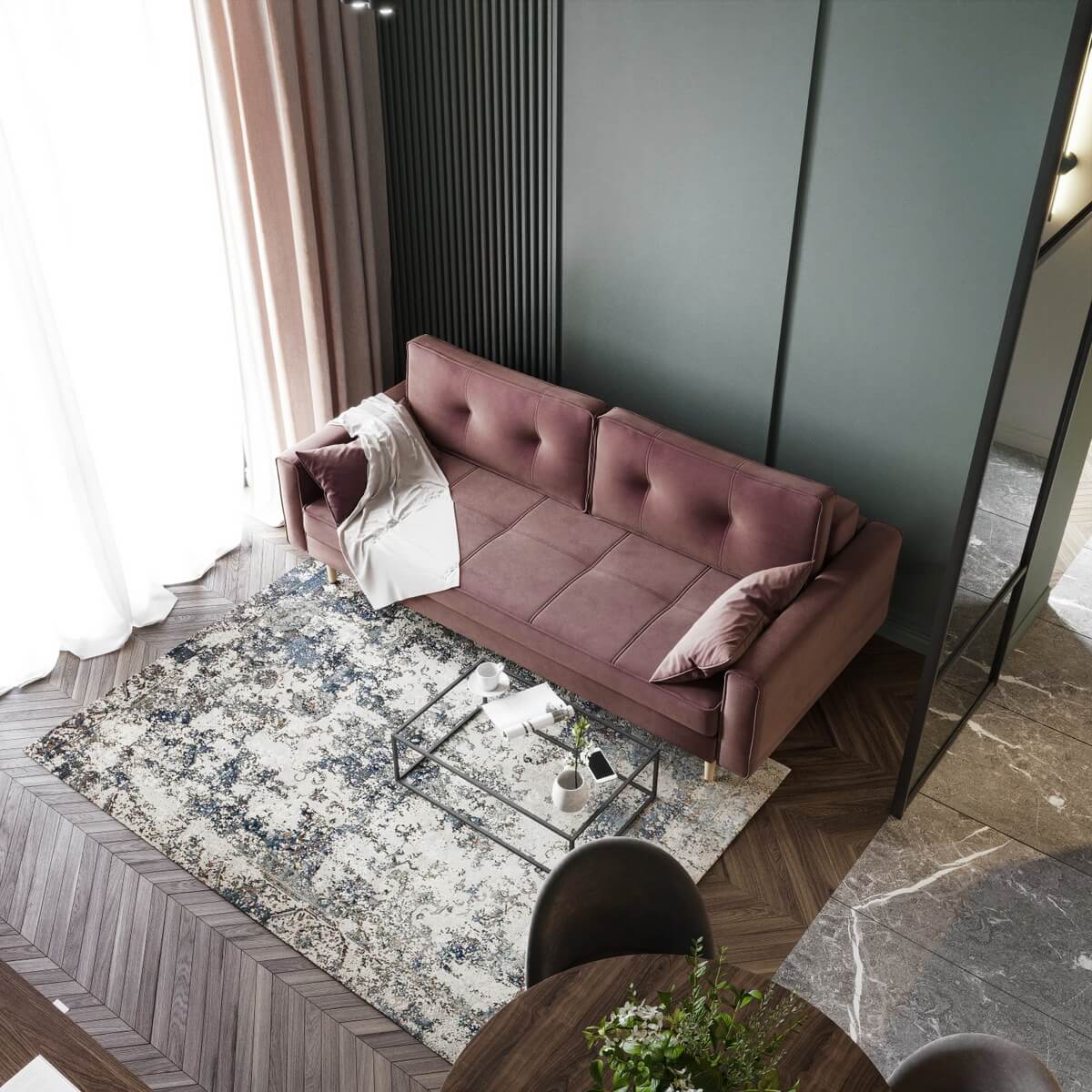 Диван имеет систему трансформации «тик-так». Так же диван укомплектован двумя большими подушками в единой ткани с диваном. Имеет небольшой короб для хранения.