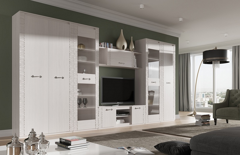 Гостиная «Элана» обязательно покорит любителей минимализма и сторонников практичности, ведь она может комплектоваться по Вашему желанию различными шкафами достаточной вместимости и полками, на которых удобно разместятся и важные мелочи.