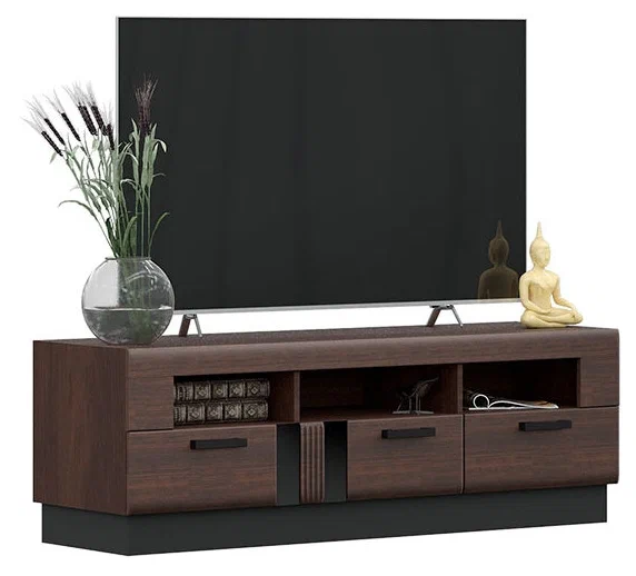 Широкая тумба для телевизора "Магнолия" имеет 3 выдвижных ящика и 3 открытых ниши для видео-техники или других вещей.