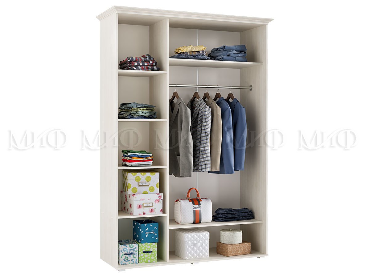 Элегантный трехстворчатый шкаф с тремя распашными дверцами, декорированными лаконичной фрезеровкой. В основании шкафа - низкие опоры. Наполнение - полки для белья и стационарная штанга.