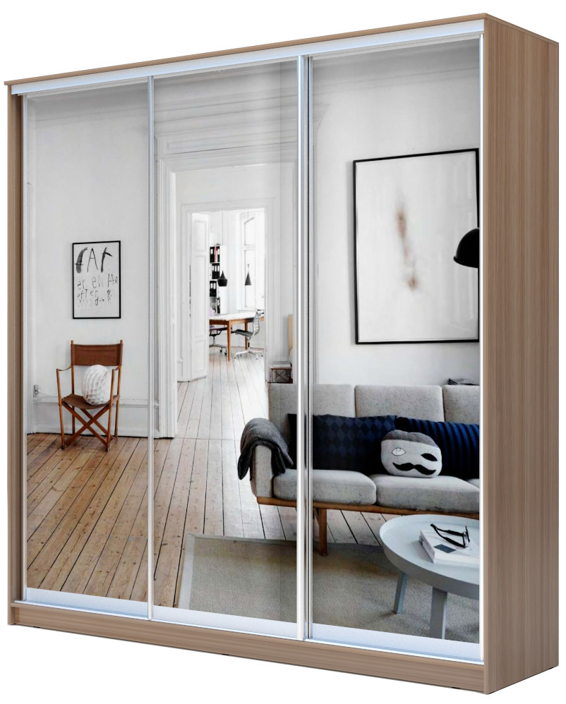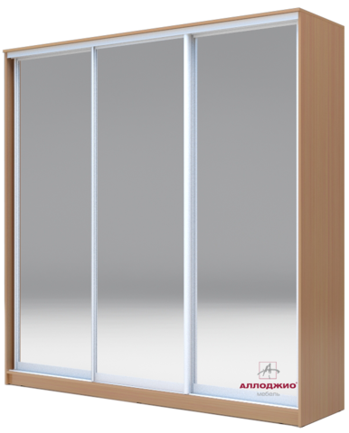 Шкаф оснащен тремя дверями-купе с наполнением зеркало серебро.