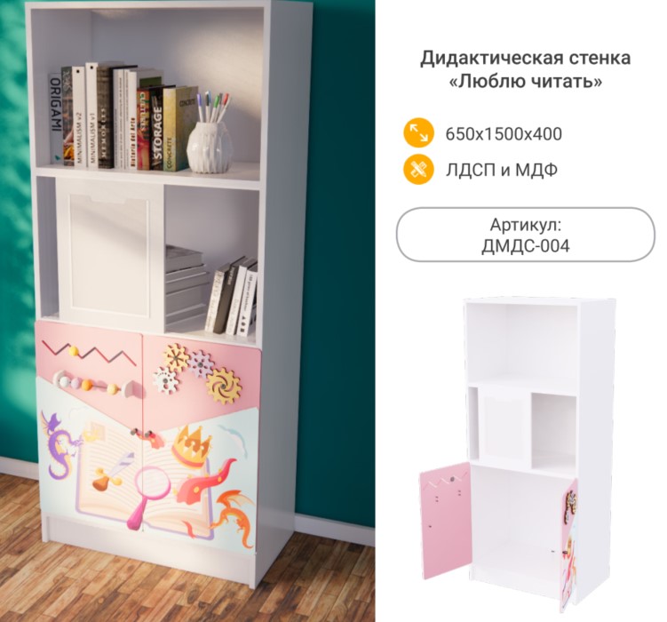 Дидактическая стенка «Люблю читать» – практичное и эстетичное дополнение обстановки группы, класса или игровой комнаты. Стеллаж помогает расширить знания детей о назначении книг, воспитать интерес и любовь к чтению.