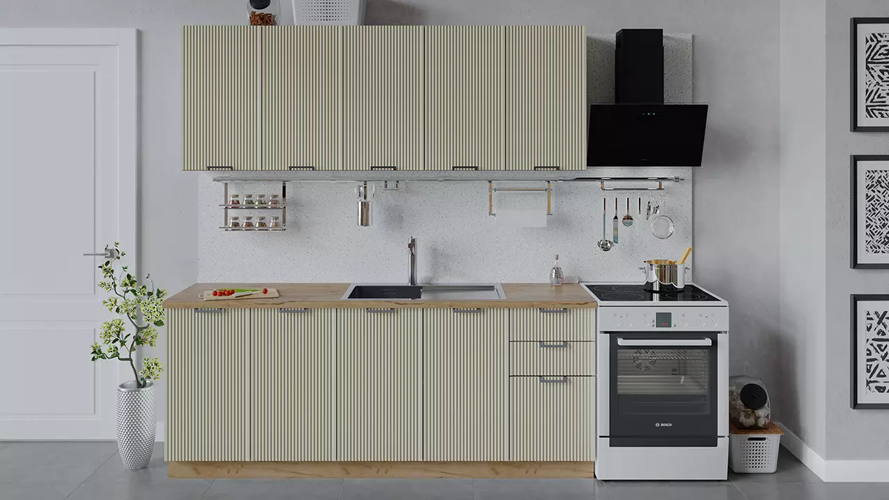 В стоимость не включено - Стеновая панель, столешница, доводчики, бытовая техника, мойка, смеситель, аксессуары.