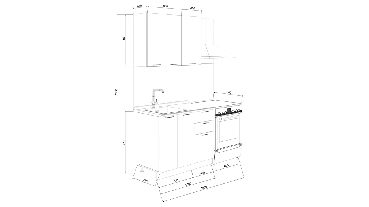 Габаритный размер готового набора модулей с учетом газовой плиты на 60 см: 160 см.