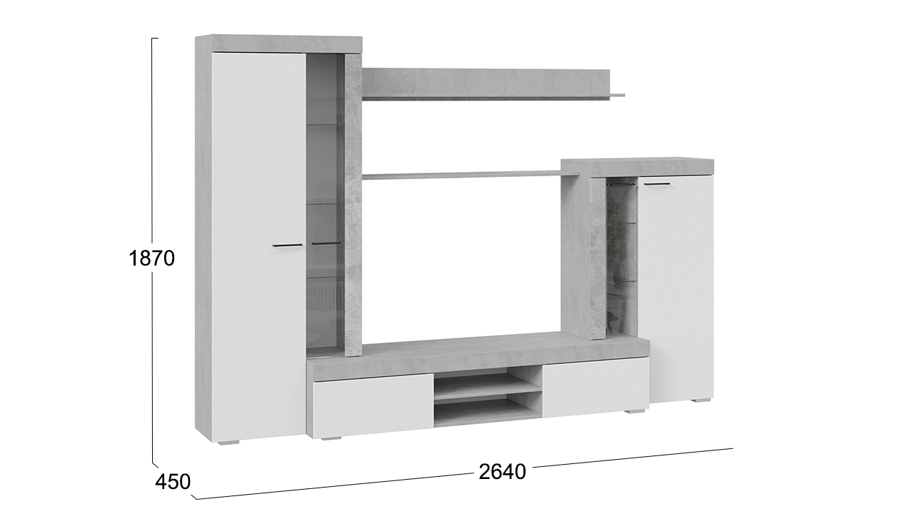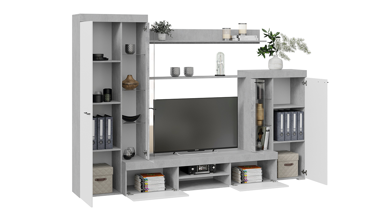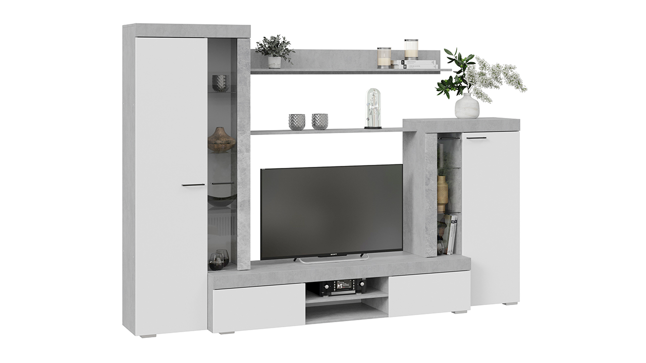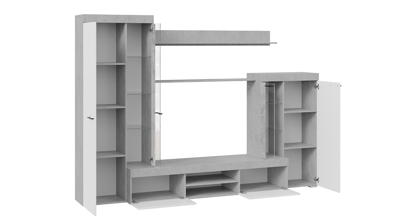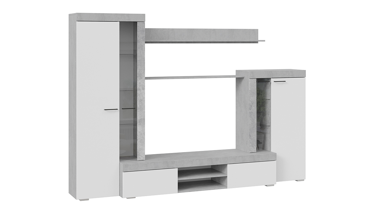 Декор. Сочетание белых фасадов, черной лицевой фурнитуры и каркасов в текстуре «Цемент светлый» способно освежить и преобразить комнату, придать интерьеру вашей гостиной современный, благородный вид.