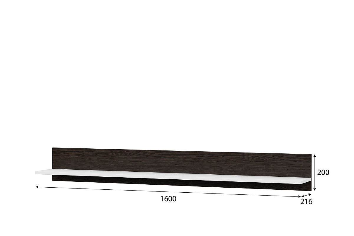 Задняя стенка полки изготавливается из ЛДСП "Дуб Венге", непосредственно сама полка из ЛДСП "Белый". Полка навешивается на стену при помощи регулируемых, врезных навесов "Hafele". Крепеж в стену в комплектацию не входит.