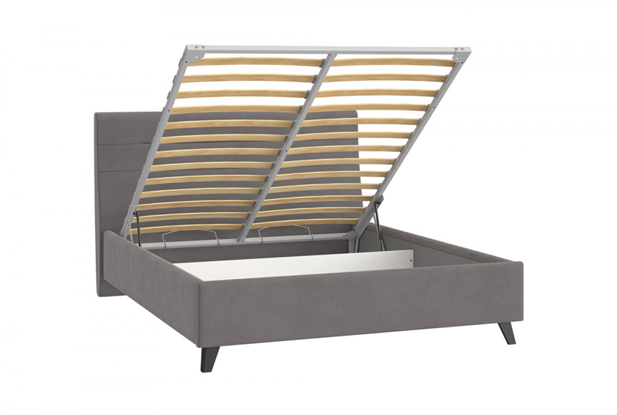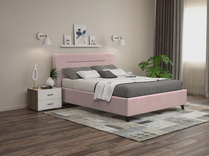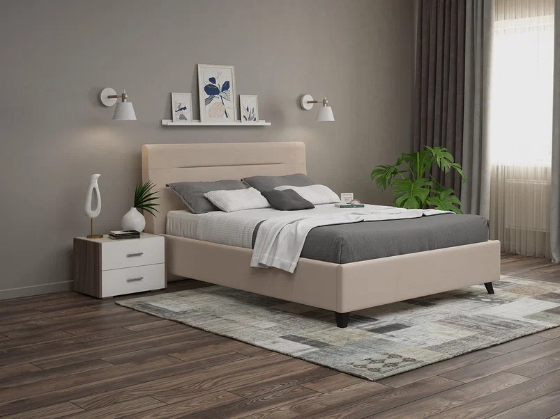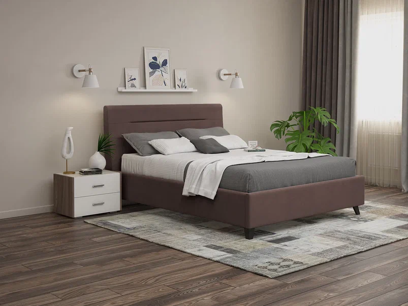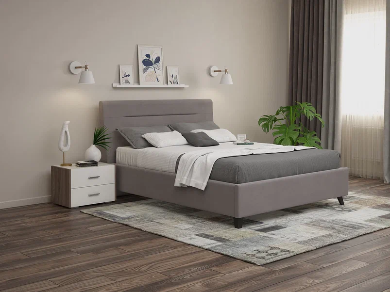 Сдержанная модель в стиле современного минимализма. Необычная форма изголовья с двумя продольными горизонтальными складками притягивает внимание и создает атмосферу гармонии и уюта в спальной комнате. Высокие металлические ножки позволяют кровати добавить легкости в интерьер, а также значительно облегчает уборку.