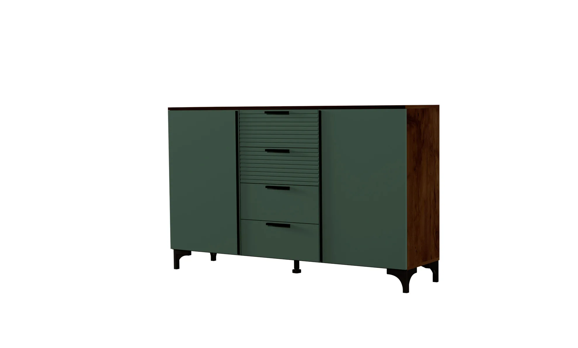 В комоде три секции, слева и справа распашные двери с двумя полками, а по середине четыре ящика на шариковых направляющих полного выдвижения.