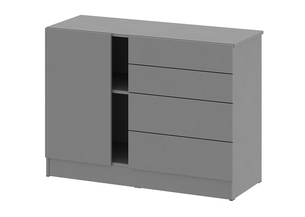 Комод шириной 1100 мм в своем контруктиве предусматривает 4 выкатных ящика разной глубины, позволяющих систематизировать хранение вещей и предметов по габаритам, и полочное провтранство за распашной створкой. Открытие всех фасадный частей осуществляется боковым захватом пальцами. Выкатные ящики шириной 600 мм открывают вместительное пространство, между ящиками и распашной створкой шириной 400 мм открытая зона полки, позволяющая разместить интерьерные декоры. Комод установлен на цоколь, на нижней части которого монтируются мебельные подпятники, защищающие напольное покрытие от истирания.