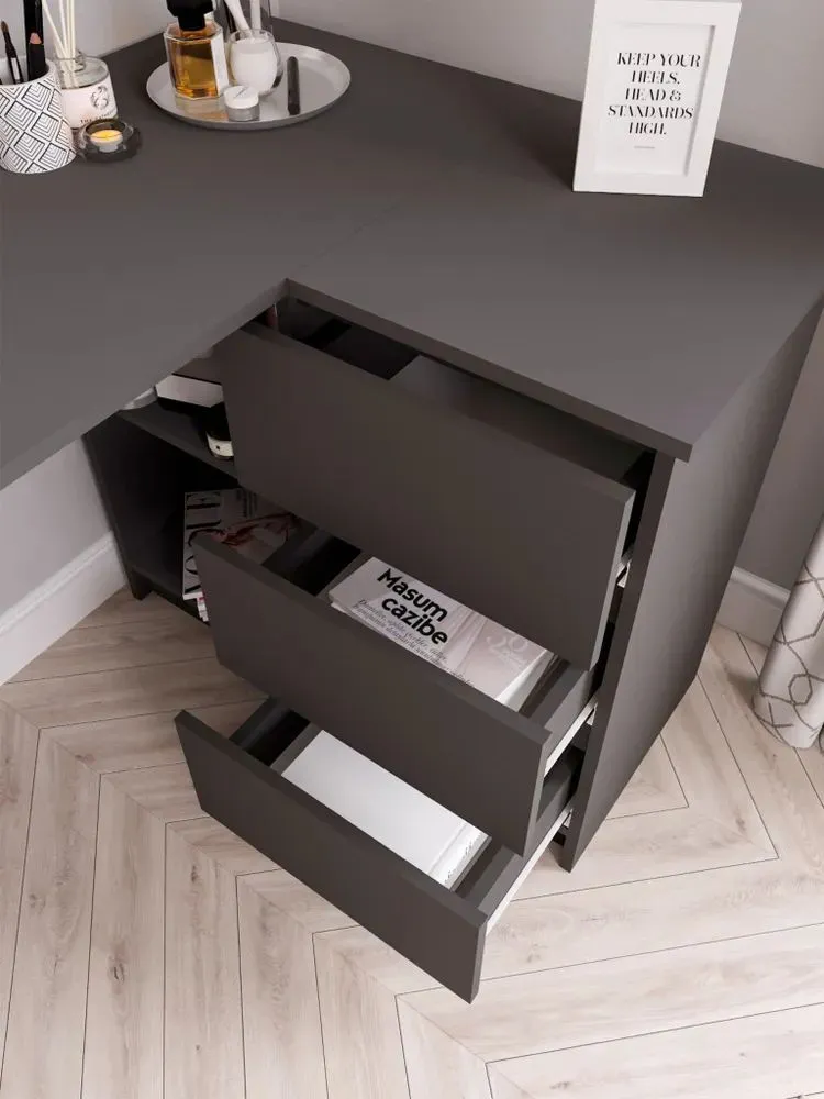 Стол универсальный Мори МС-16 возможно собрать как на правую, так и на левую сторону. Для хранения предусмотрены три выдвижных ящика. Роль ручек выполняет сам фасад, открывание ящиков происходит за счет пространства между ним и планками.