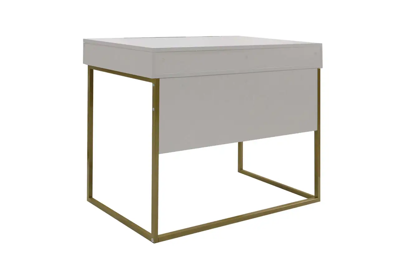 Современный лаконичный столик с выдвижными ящиками в трендовом цвете Кашемир на металлических опорах, которые можно выбрать в золотом или черном цвете.