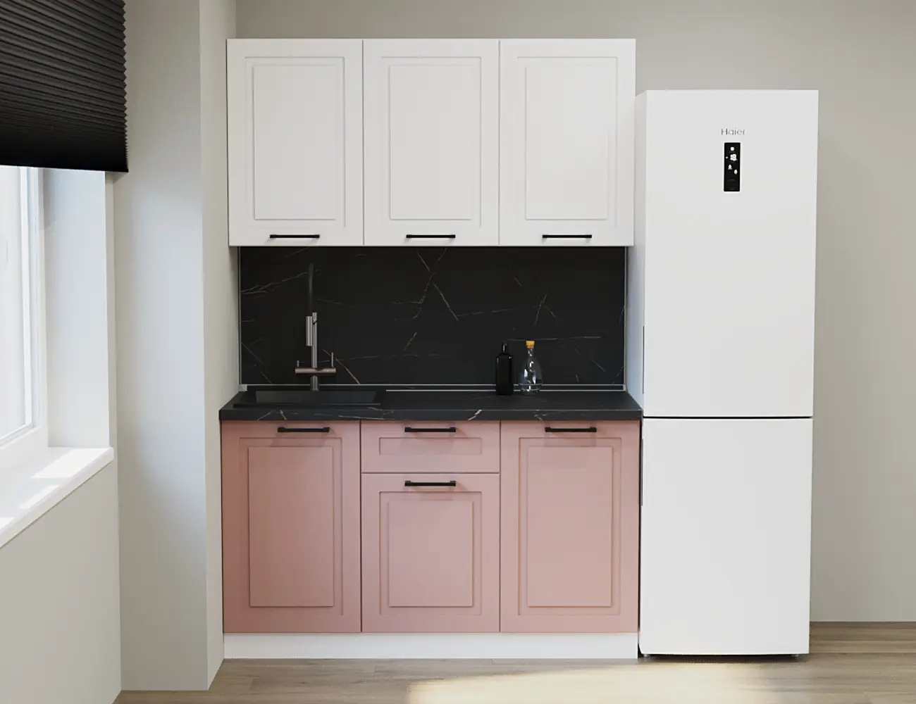 Аликанте 11: Цвет фасада: Шарли Pink, Шарли белый, корпус Серый, столешница 28мм: Каспий черное золото