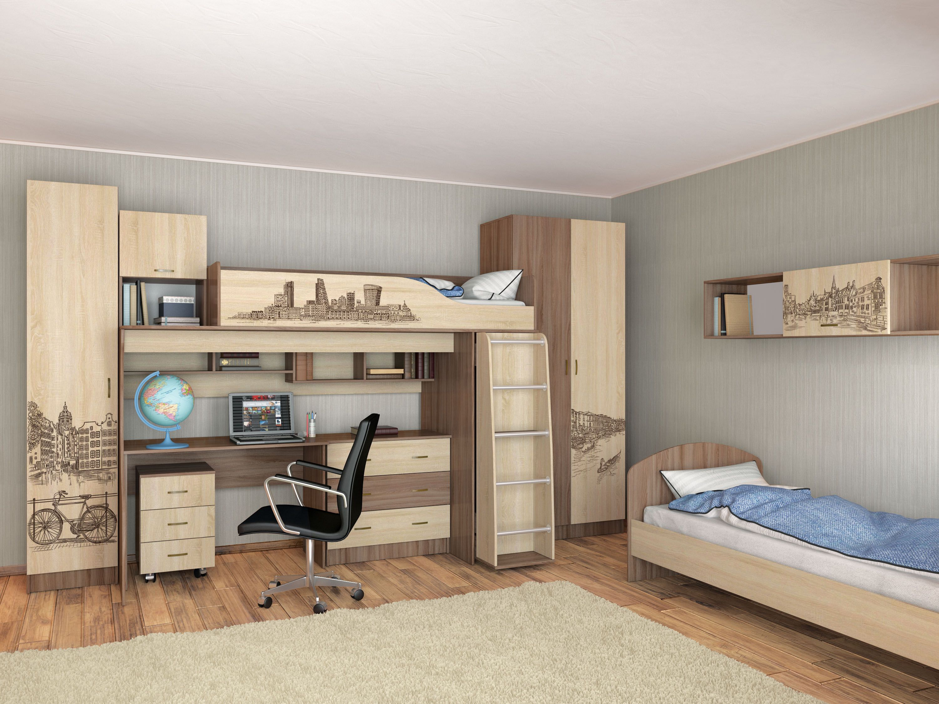 Композиция для детской спальни Орион - идеальное решение как для просторной комнаты, так и для малогабаритной квартиры. Широкий выбор модулей: функциональная кровать-чердак со встроенным шкафом, пенал для белья, полноценный комбинированный шкаф со стандартной штангой и полками. Классические цвета исполнения прекрасно сочетаются с дизайнерскими изображениями городов мира, нанесенными на фасады методом цветной фотопечати.
