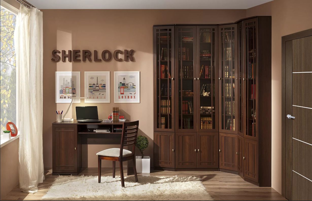 В наше время всё больше людей работают дома: деловые люди, которые продолжают работу после офиса по вечерам, творческие личности, для которых необходима спокойная домашняя обстановка на рабочем месте. Модульная серия SHERLOCK, позволит организовать своё рабочее место в современной квартире. Проверенные временем формы, рамочные фасады с переплетом и декоративной раскладкой, тонированное стекло – подчеркивают классический стиль коллекции.
