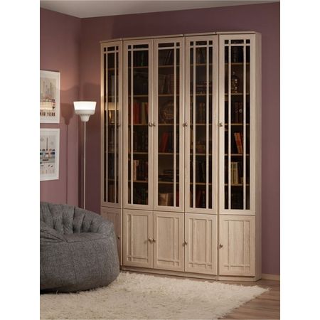 • Комбинация высоких шкафов для книг. Благодаря своей высоте они удивительно ёмкие и вместительные. Предусмотренная регулировка высоты полок позволит поместить книги любого формата. Тонированные стеклянные дверцы защитят содержимое от прямых солнечных лучей и пожелтения страниц. Необходимо дополнительно крепить к стене за подвесы, для устойчивости.