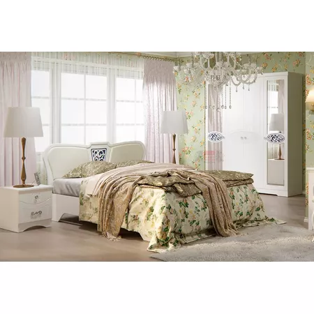 Спальный гарнитур в классическом стиле с фигурными фасадами из МДФ. Кровать оснащена ортопедическим основанием. Матрас в комплект не входит и приобретается отдельно.
