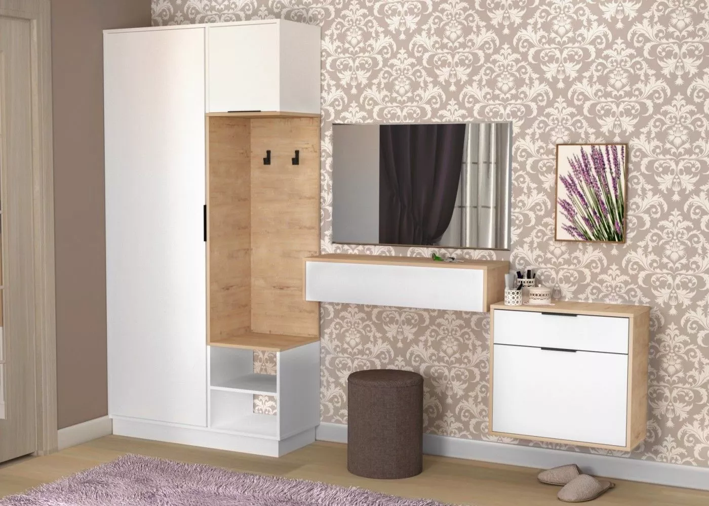 В дизайне мебели для прихожей Лофт Визит-3, используется актуальное сочетание древесных текстур и камня, белого цвета. Разнообразие модулей коллекции позволяет создать функциональный интерьер для помещения любого размера.